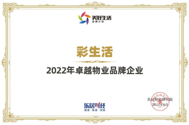 8月19日,由樂居財經(jīng)主辦的“2022(第五屆)樂居財經(jīng)年度論壇暨財經(jīng)之夜”在杭州拉開帷幕,彩生活蟬聯(lián)“2022年卓越物業(yè)品牌企業(yè)”獎項?!白吭轿飿I(yè)品牌企業(yè)”由樂居財經(jīng)研究院通過研究和結(jié)合行業(yè)內(nèi)專家評價,從物業(yè)企業(yè)的營業(yè)數(shù)據(jù)、商業(yè)布局、品牌知名度、服務(wù)滿意度、業(yè)主體驗、社會責(zé)任感等多角度進(jìn)行評選得出,旨在探尋在物業(yè)領(lǐng)域保持前進(jìn)動力、不斷突破邊界,為美好社會創(chuàng)造更多價值的優(yōu)秀物業(yè)品牌標(biāo)桿。