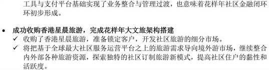 此外,根據(jù)集團整體戰(zhàn)略布局,花樣年年內(nèi)收購了國內(nèi)一家具全牌照的第三方支付平臺,為社區(qū)金融業(yè)務(wù)提供有效的支付工具與支付平臺。此次收購成功實現(xiàn)了業(yè)務(wù)整合與管理過渡,也意味著花樣年社區(qū)金融閉環(huán)初步形成。