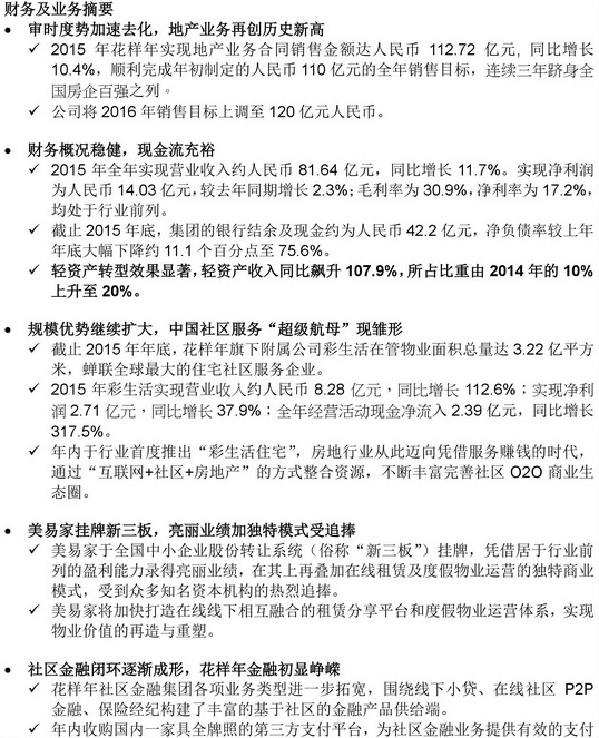 潘軍在業(yè)績發(fā)布會上表示,2016年是花樣年集團發(fā)展與擴張階段的重要節(jié)點,公司將繼續(xù)立足于社區(qū),調(diào)整業(yè)務(wù)結(jié)構(gòu),進一步實現(xiàn)輕資產(chǎn)化,通過整合企業(yè)內(nèi)外資源,形成基于社區(qū)綜合服務(wù)、金融的有機生態(tài)圈系統(tǒng)。完成業(yè)務(wù)體系由硬到軟,由重到輕的深化,加大商業(yè)模式的創(chuàng)新和服務(wù)價值的挖掘,并適時進行新的資本運作。