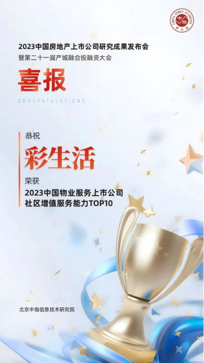 5月18日,由中國(guó)企業(yè)評(píng)價(jià)協(xié)會(huì)、清華大學(xué)房地產(chǎn)研究所、北京中指信息技術(shù)研究院主辦,北京中指信息技術(shù)研究院中國(guó)房地產(chǎn)TOP10研究組承辦的“2023中國(guó)房地產(chǎn)上市公司研究成果發(fā)布會(huì)暨第二十一屆產(chǎn)城融合投融資大會(huì)”召開。會(huì)上,深圳市彩生活服務(wù)集團(tuán)有限公司憑借高質(zhì)量發(fā)展的社區(qū)增值服務(wù)能力,榮獲“2023中國(guó)物業(yè)服務(wù)上市公司社區(qū)增值服務(wù)能力TOP10”榮譽(yù)。