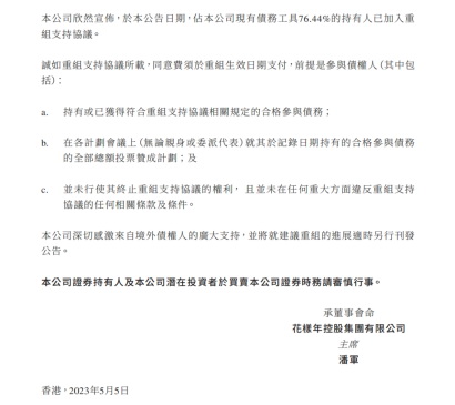 5月5日晚間,花樣年控股(01777.HK)披露關(guān)于重組的最新情況。公告顯示,于本公告日期,占本公司現(xiàn)有債務(wù)工具76.44%的持有人已加入重組支持協(xié)議。